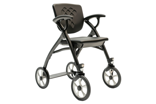 Lightweight, modern rollator walker with comfortable seat for seniors, designed for mobility and support in daily activities. on transparent background