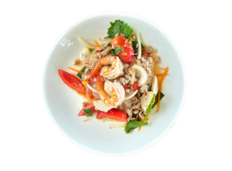 Spicy Glass Noodle Salad, mixed shrimp with minced pork (Thai call Yum Woon Sen). high angle view. on transparent background