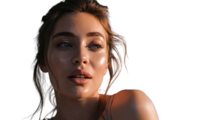 Close-up portrait of a young woman bathed in warm, natural light, with a serene expression.