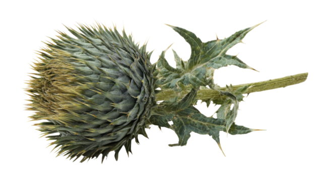 Thistle bud forming with spiky sepals and green leaves on a transparent background, symbolizing wild nature and resilience