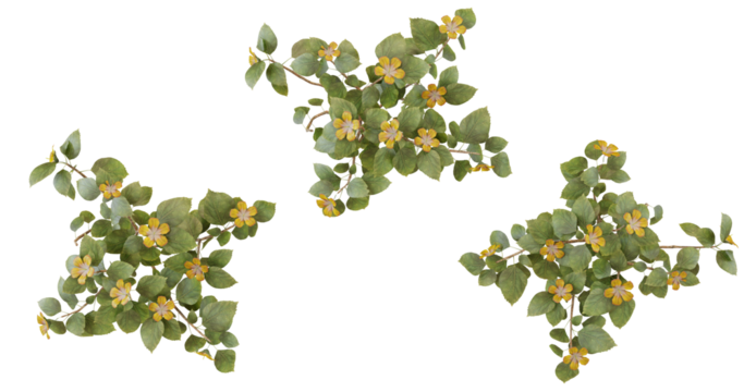 Top view of green foliage with yellow flowers. Three separate plants arranged in a triangle.