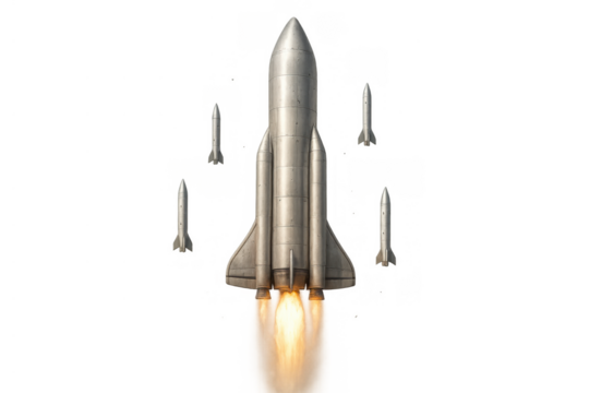 Spaceship moving upward with an exhaust flame, boosters separating, symbolizing future travel and innovative science