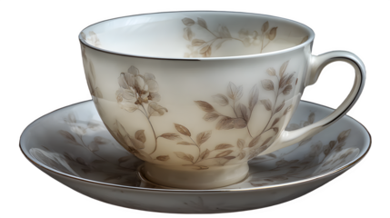 Elegant porcelain teacup and saucer set featuring delicate sepia floral engravings on black