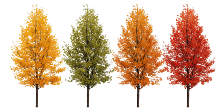 Four trees showing the colors of autumn isolated on transparent background, from yellow to red