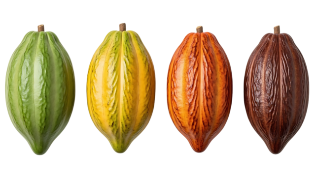 Four sequential stages of ripening nuts from green to dark brown in side view isolated on a transparent background