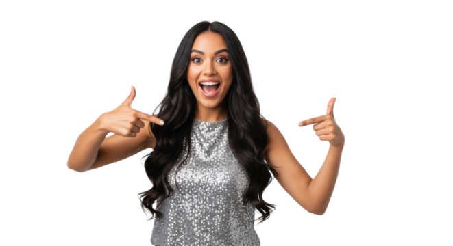 Young multi-ethnic woman with glossy dark wavy hair wearing a silver sequined top, smiling vibrantly and pointing outwards against a high-key white studio. Concept for promotional advertising