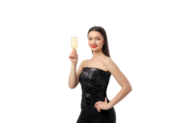 Woman holding a champagne glass wearing a sequined top, isolated, PNG