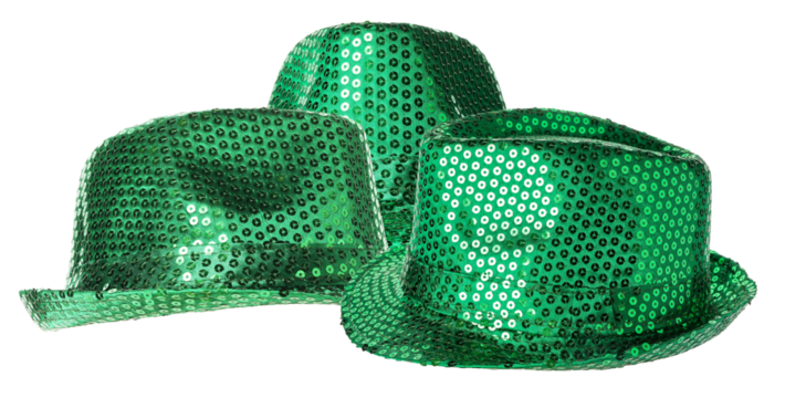 group of three green sequined hats, including a fedora and bowler style, sparkling brightly for festive occasions.