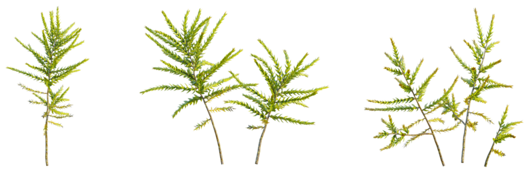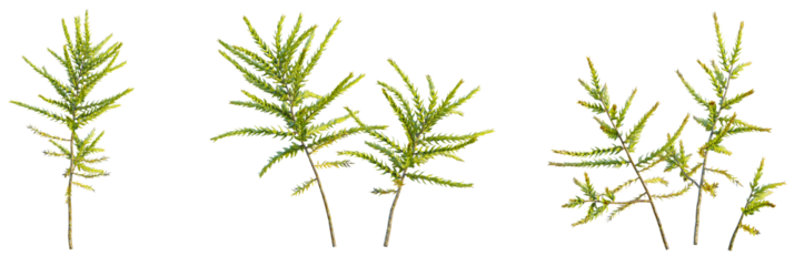 Climacium japonicum tree, font view, elevation, cutout, isolate, transparent background, Three delicate sprigs of green coastal redwood ready for design elements