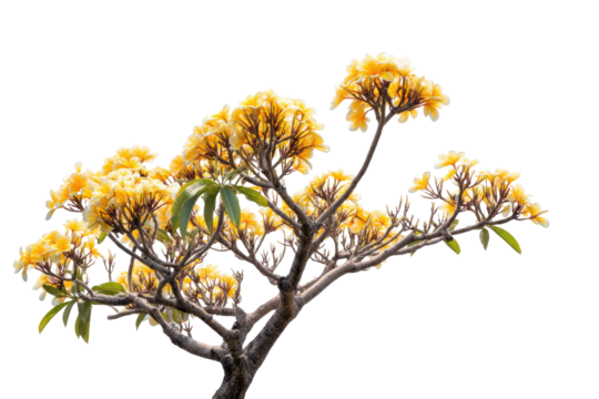 A beautiful plumeria tree in full bloom, featuring clusters of vibrant yellow-white flowers and green leaves, ideal for design projects. background removed