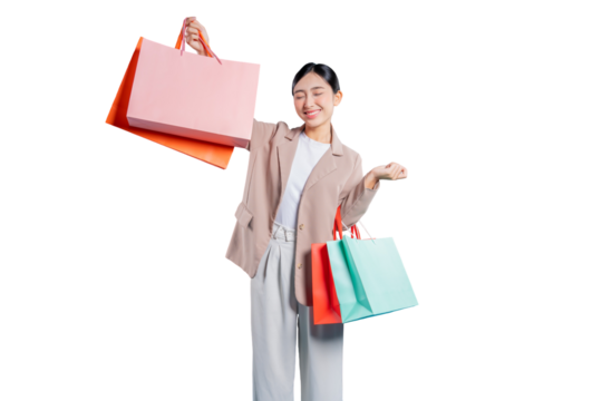 A blissfully happy young Asian woman smiles with her eyes closed in pure satisfaction, holding up her shopping bags after a successful shopping day, isolated on a  png background.