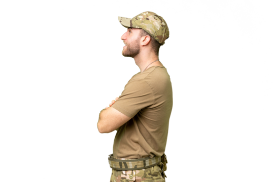 Military man over isolated chroma key background keeping a conversation with the mobile phone with someone