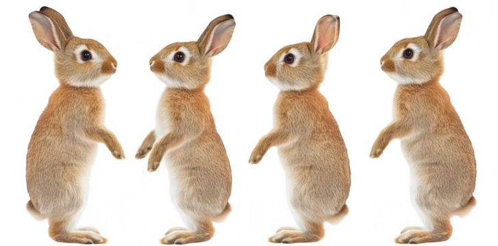 A series of four adorable rabbits standing upright. their soft fur and expressive faces. set against a clean white background. ideal for educational or nature-themed projects