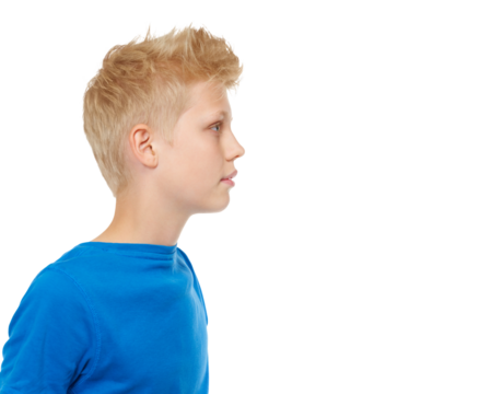 Profile, kids and fashion with a confident boy isolated on a transparent background in trendy clothes. Children, style and face with a fashionable male teenager posing in casual clothing on PNG
