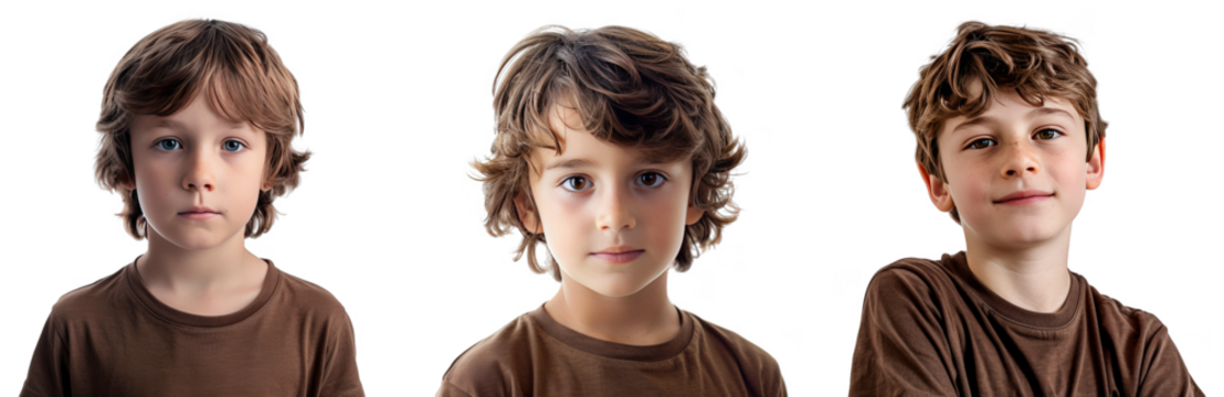 Portrait Collection of young boy with brown shirt with a curious face isolated on a white background as transparent PNG