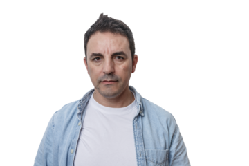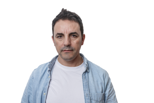 Man with short dark hair wearing a light denim jacket and white shirt against a plain white background