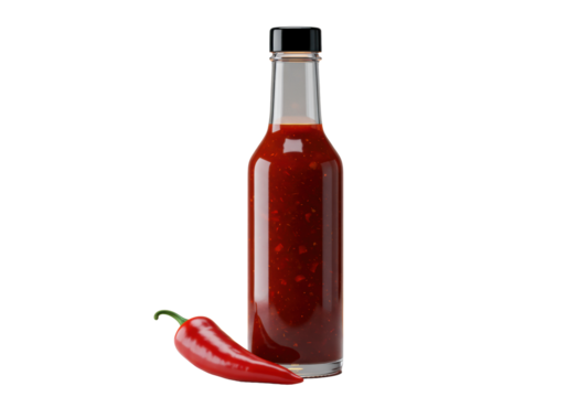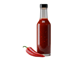Sleek transparent glass bottle of gourmet red hot sauce with vibrant red liquid and fresh serrano chili pepper, isolated on transparent with glowing orange-yellow aura, Concept of intense spicy flavor