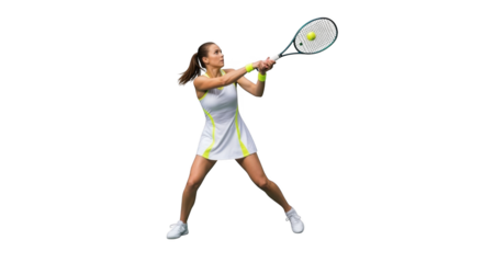 Female tennis player stretching arm to reach ball mid-flight in motion pose on transparent background. Concept of summer games, women tennis, determination, speed, focus, sports visuals and branding.