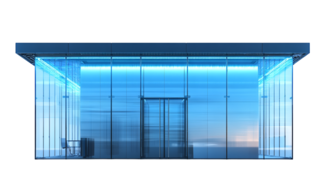Glass wall of a modern business office building with blue light in city isolated on white background