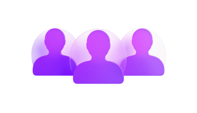 Trio of translucent, rounded, purple silhouettes of people against a black background, stylized icons