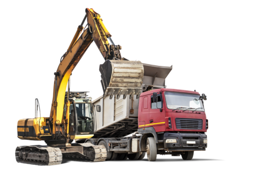 Construction equipment featuring a yellow excavator and a red dump truck is isolated on a white background, highlighting their importance in urban construction projects.