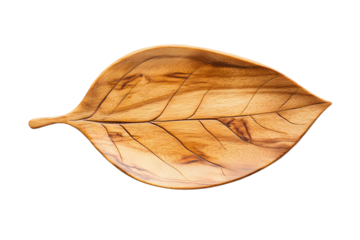 Wooden leaf-shaped tray with visible wood grain. Perfect for nature-inspired home decor or rustic serving dishes. Isolated on black.