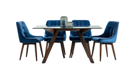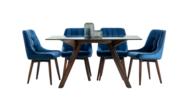 A modern wooden dining table set with four matching chairs designed for contemporary interiors on transparent background.