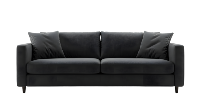 Chic black leather sofa on transparent background.