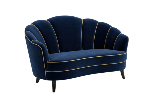 Blue velvet shell sofa with gold piping details. Modern retro furniture.