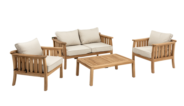 Light-brown wooden outdoor furniture set.  Cream-colored cushions