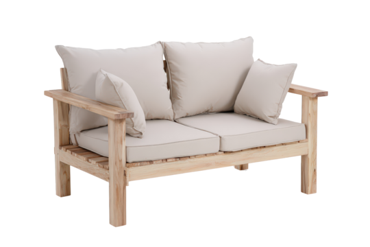 Two seater wooden patio sofa with comfortable beige cushions isolated on a white background.