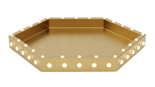 A gold colored hexagonal tray with lit candles around the edge