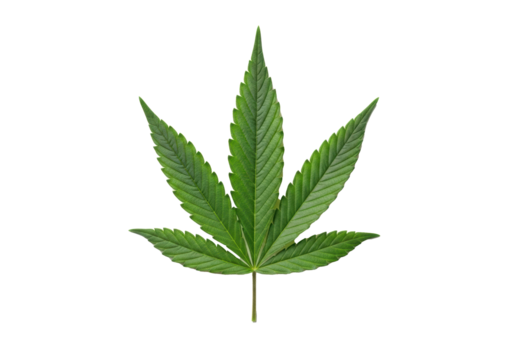 Vibrant, fresh green Cannabis sativa leaf, seven serrated lobes, intricate veins, isolated on transparent background with copy space, top-view, studio lighting. Concept of natural botanical medicine