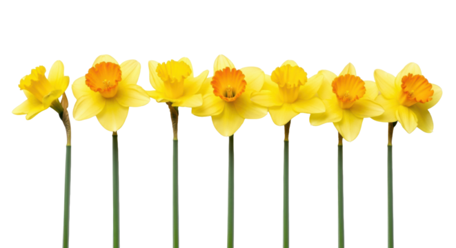 Seven vibrant yellow daffodils with green stems in a horizontal row, varying blooms, yellow to orange coronas, on a clean white background with ample negative space and even studio lighting,