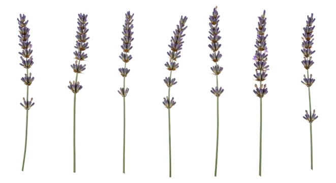 Seven Stems of Lavender Flowers Isolated on White Background.