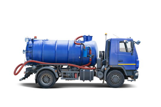 A blue vacuum truck, isolated on a background, ready to pump and remove liquid waste. The truck is equipped with hoses and equipment for efficient waste disposal and removal.