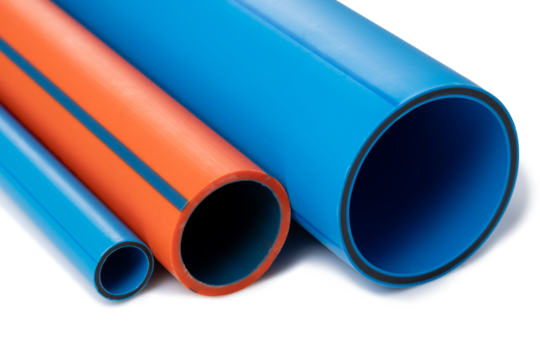 Close-up studio shot of three large, durable plastic pipes in varying shades of blue and vibrant orange, isolated on a white background.