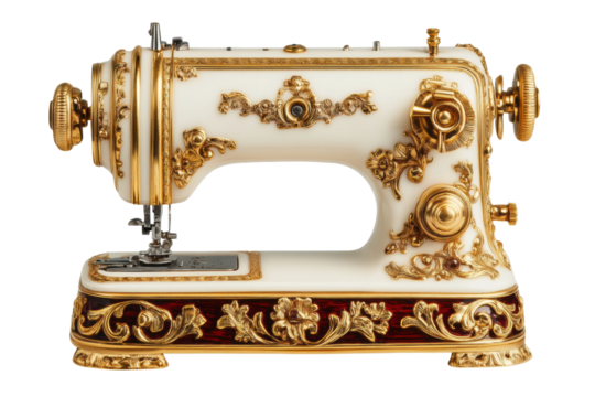 Ornate vintage sewing machine with gold details and floral design, cut out