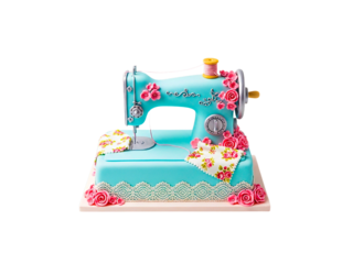 Quirky turquoise sewing machine cake decorated with pink flowers and fabric pattern, perfect for a crafting theme cutout on transparent background.