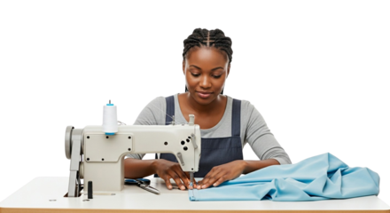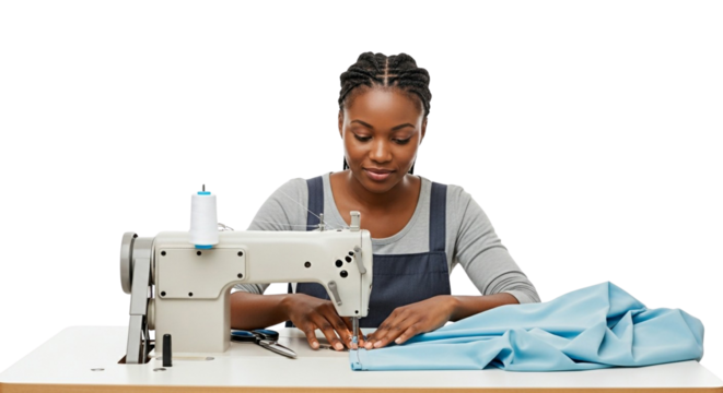 Vintage sewing machine with spools of thread and fabric, isolated on transparent background