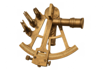 Antique brass sextant for celestial navigation and maritime exploration on a transparent background