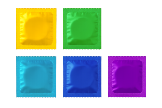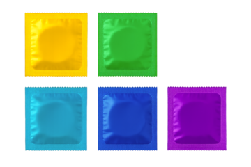 Set of multi-colored packages of latex condoms, on an isolated background. Condoms, contraceptives for safe sex, prevention of STDs, sexual health.