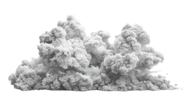 Explosion cloud generating thick gray smoke and dust, bursting on transparent background, symbolizing danger and pollution