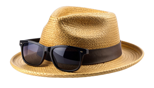 Stylized cartoon sun hat with bright yellow band on transparent background