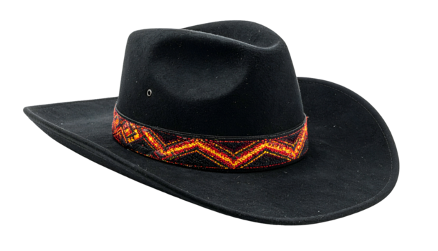 Dark cowboy hat with colorful band detail, isolated against a transparent background
