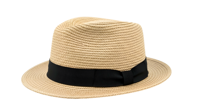 A tan-colored fedora hat with a black band, sitting on a transparent background