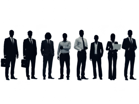 Silhouettes of business people standing in a row, group of professionals in formal attire, isolated on transparent background