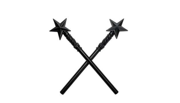 Two dark, crossed staffs topped with five-pointed stars against a black backdrop