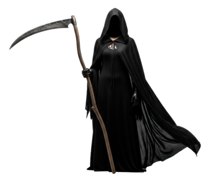 A black cloak with a hood and a long, curved scythe in the hands of a figure in a dark, shadowy setting.