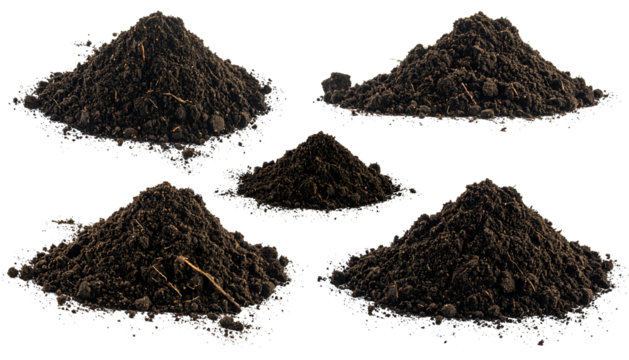 Five piles of dark, rich soil against a transparent background, perfect for gardening